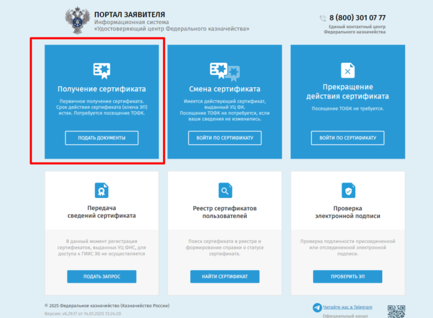 1.  После установки КриптоПро CSP и плагина КриптоПро, заходим на портал заявителя УЦ Федерального казначейства по адресу: https://fzs.roskazna.ru .